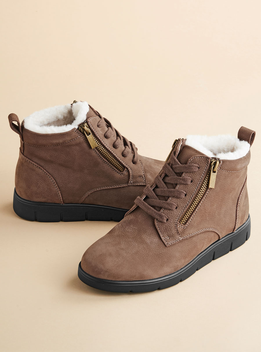 Sherpa-lined suede zip boots with a removable antibacterial-treated insole, designed to keep your feet warm and comfortable. Ankle boots that are easy to slip-on, easy to wear and soft to the touch, they combine cosy insulation with everyday practicality. Genuine Leather Upper. Non-slip polyurethane sole. 2.5cm wedge heel.
