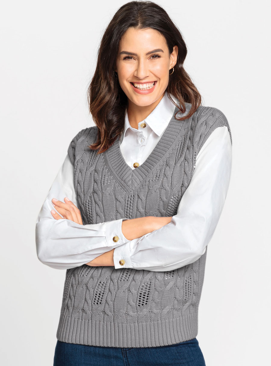 A sweater vest in a soft cotton mix. With a combination of cable and ajour patterns at the front and a plain back. Rib knit on the V-neck and the wide hem with additional integrated elastic. 50% Cotton, 50% Acrylic.