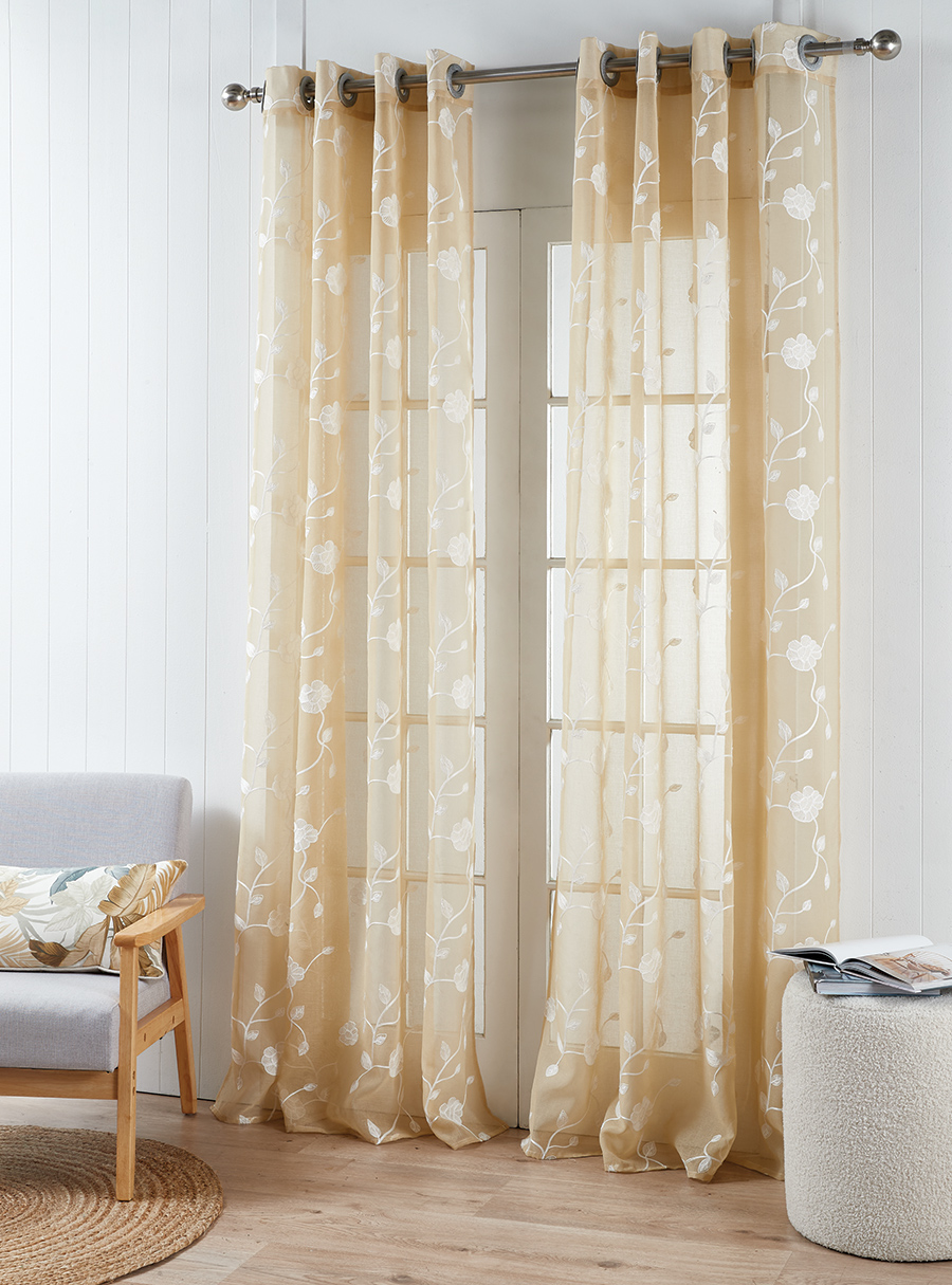 Bring a touch of natural elegance with these sheer curtains. Each 140 × 230 cm panel features white floral embroidery with flowing stems and leaves, letting sunlight filter gently through. Hanging on eight silver-toned eyelets, they drape gracefully and are sold in packs of two – perfect for a serene, inviting touch in any room. Available in two timeless shades - Natural or Chocolate (Code: SEMCH).