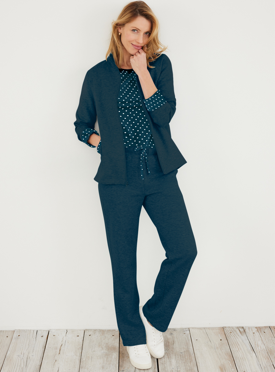You will love this amazing 3 piece tracksuit! Featuring a jacket with zip front and front pockets with contrast polka dot trim inside the collar. Full length pants with tie front and elastic waist for a comfortable fit and 2 side pockets. Crew neck printed tee featuring a lovely polka dot design. 65% Polyester, 35% Cotton.