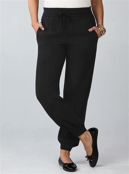 Effortless comfort meets standout style. Featuring an easy pull-on waistband and gently gathered cuffs, these pants offer a breathable, lightweight feel with a flattering drape. The perfect mix of casual chic and everyday wearability. 100% Viscose.