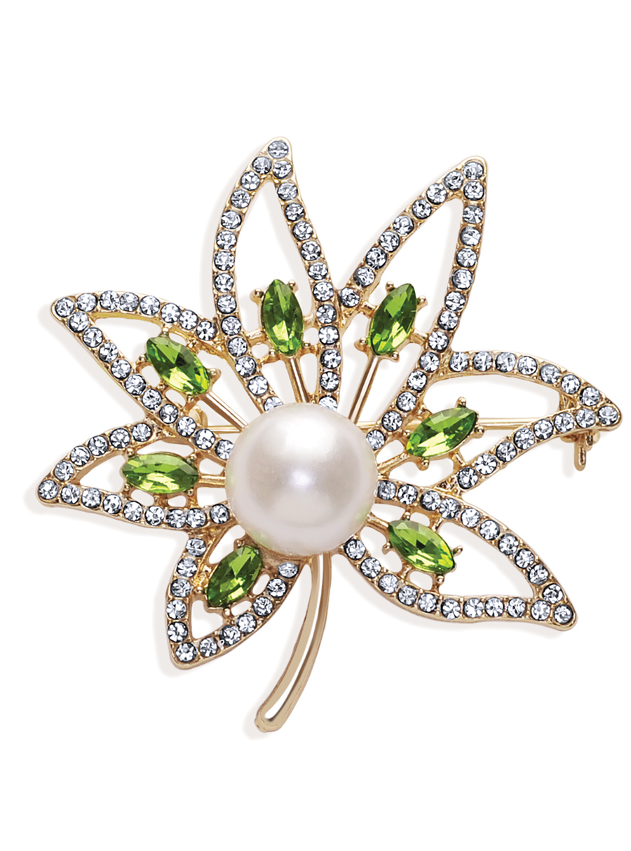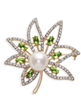Gold tone alloy brooch with green crystals & faux pearl. Length 4.8 cm.