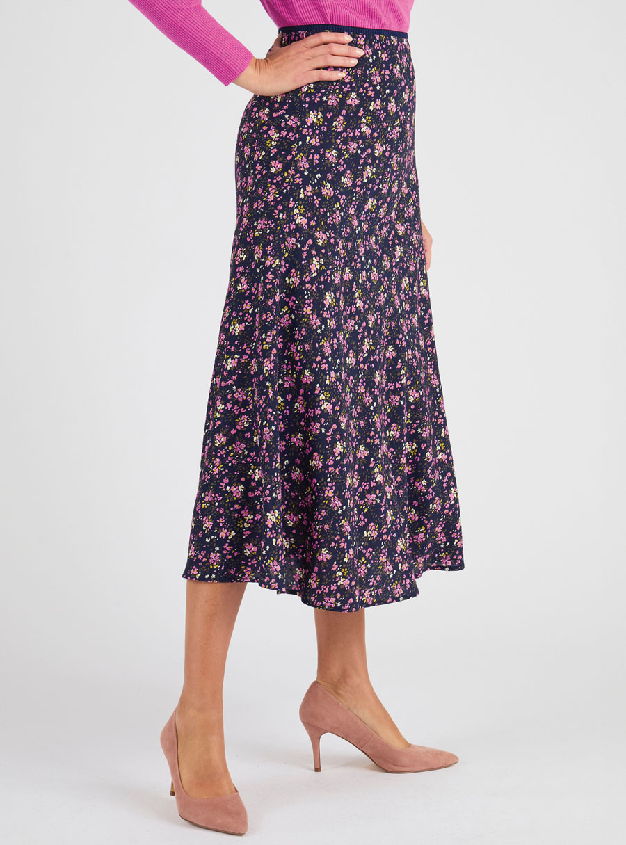 A timeless floral skirt with a flattering flared cut and elasticated waistband, perfect for all body types. 100% Viscose.