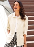 Stylish blouse blazer in a textured fabric with trendy details. Shirt collar and full-length button placket with press studs. The long sleeves can be rolled up into 3/4-length sleeves and fastened with a latch and press stud. Drawstring with cord at waist height, 2 patch flap pockets with press studs. Viennese seams ensure a perfect fit. 90% Viscose, 10% Polyamide.