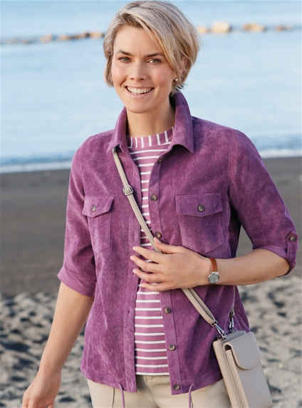 On-trend corduroy! Long-sleeved blouse with a shirt collar, button placket and patch flap pockets. The box pleat at the back gives a flattering width. If you wish, you can roll up the sleeves to 3/4 length and then fasten them with a tab and button. The width of the hem can be adjusted using a drawstring. 90% Polyester, 8% Nylon, 2% Elastane.