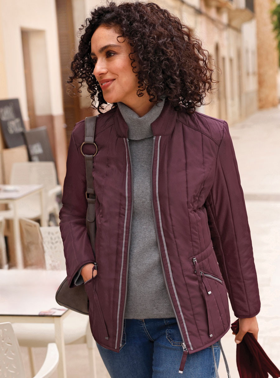 This quilted jacket in a finely shimmering, padded fabric is a warm winter companion and trendy eye-catcher with lots of great details. Fashionable stand-up collar and zipper. Drawstring with stoppers to individually adjust the waist size. 2 practical zipped pockets and 1 additional inside pocket.