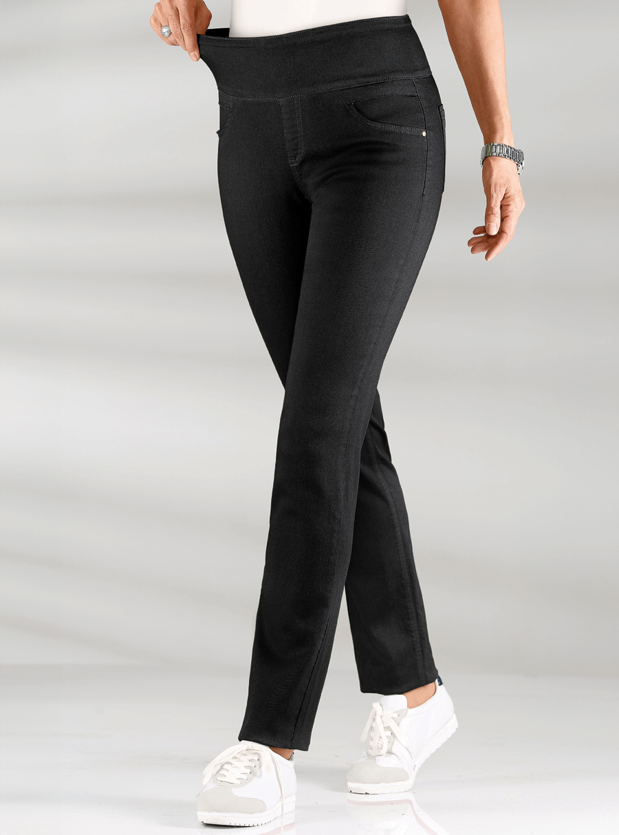 Pants with a high, all-round stretch waistband: not only are they wonderfully comfortable, they also cleverly conceal any tummy bulges! With a faux zipper fly, 2 imitation pockets at the front and 2 back patch pockets. Length: 103cm-107cm. 76% Cotton, 22% Polyester, 2% Elastane.
