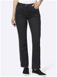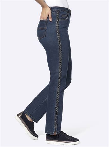 5-pocket jeans with visually elongating braided trim along the side seams. Belt loops, button and zipper closure. Belt not included. 79% Cotton, 19% Polyester, 2% Elastane.