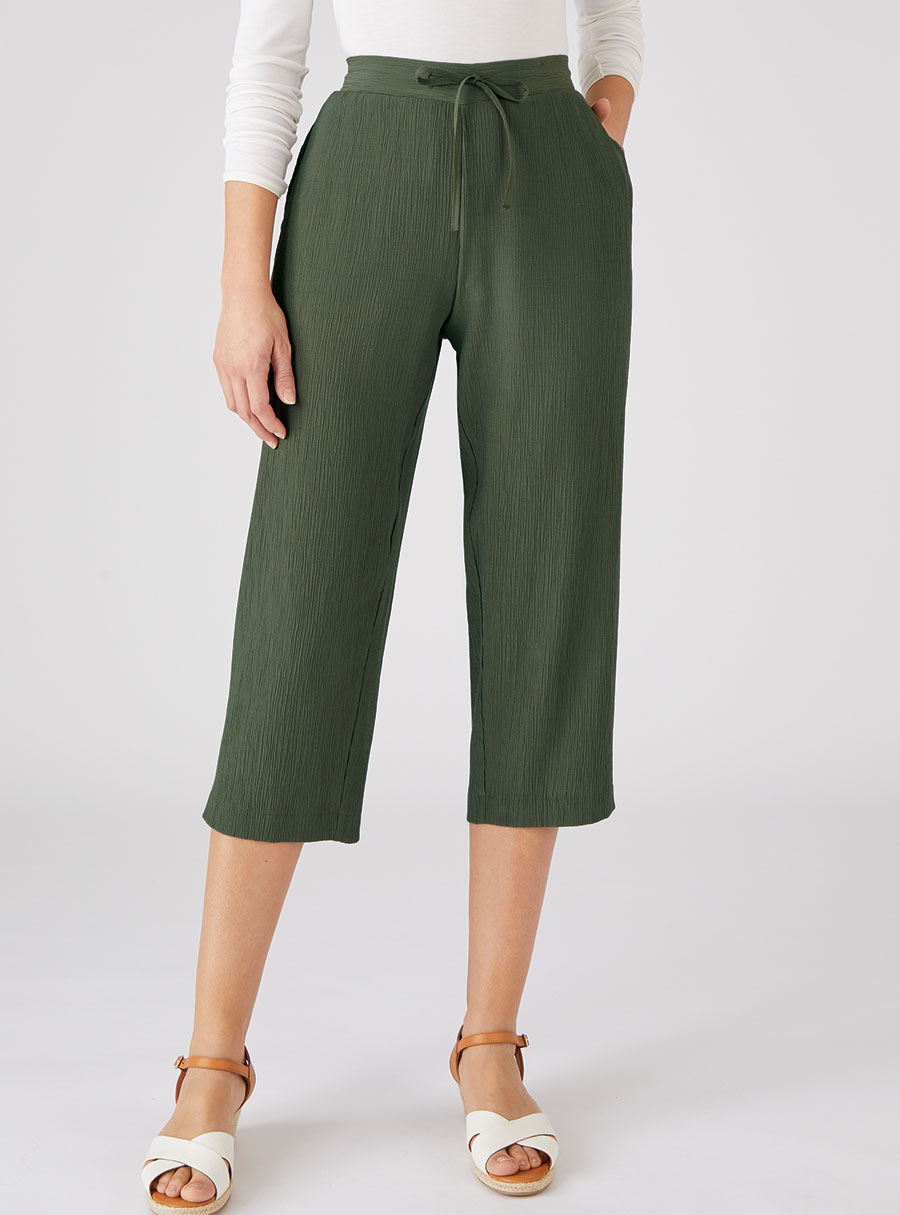 Pull-on crinkle crops with full elastic waist. Side pockets and front drawstring. 78% Viscose, 22% Polyester.