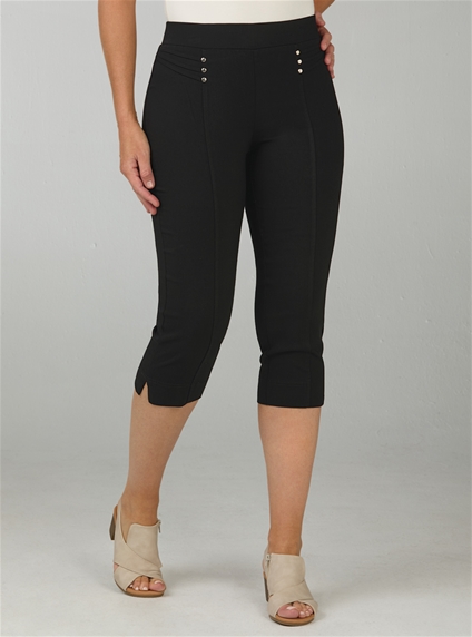 These pull-on pants will complete any outfit this season. Made in a soft comfortable viscose blend with stretch to move with you. Featuring decorative rivets alongside pintucks and a front panel to elongate the legs. 76% Viscose, 21% Nylon, 3% Elastane.