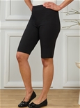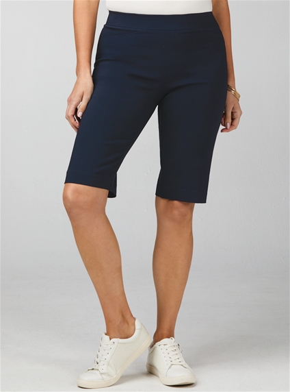 Sleek pull-on bengaline shorts featuring a smooth, wide waistband and a flattering knee-length cut. Designed for comfort and ease, they offer a clean, streamlined silhouette perfect for everyday wear or relaxed travel styling. 76% Viscose, 21% Nylon, 3% Elastane.