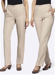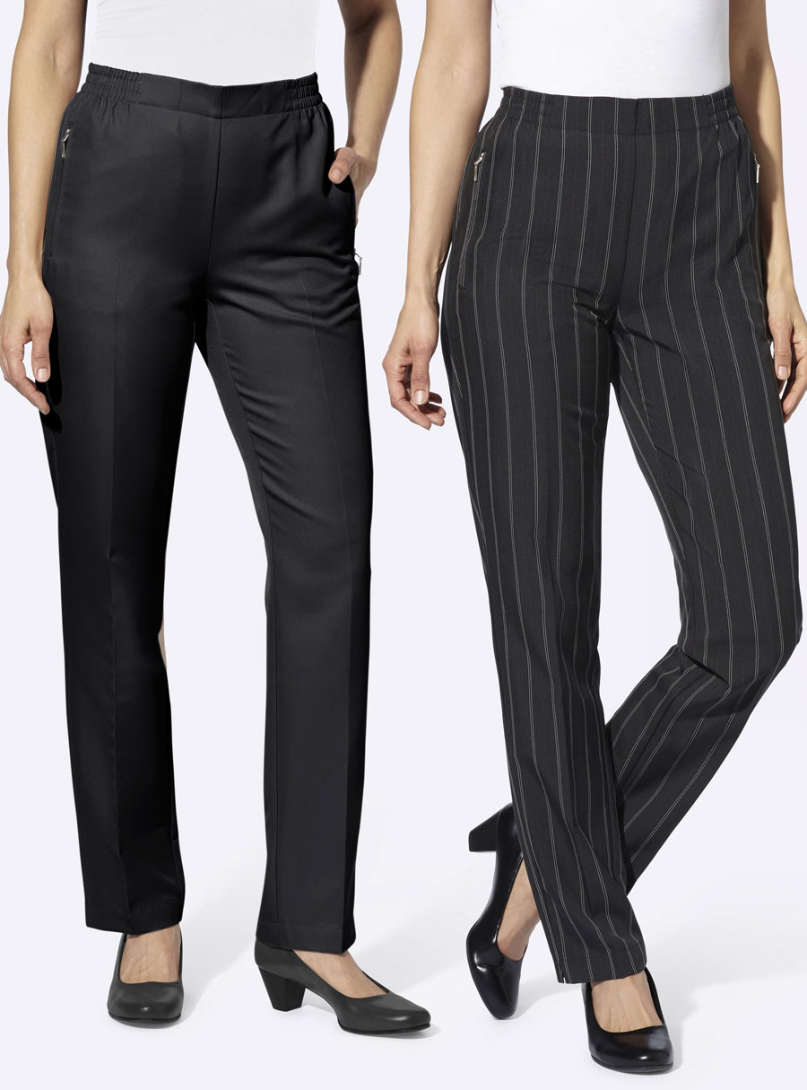 Slip-on trousers in an affordable double pack: 1x in plain, 1x with fine pinstripes. In a neat woven fabric with a crease. Smooth at the front, with a comfortable stretch waistband at the sides and back. 2 zipper pockets.