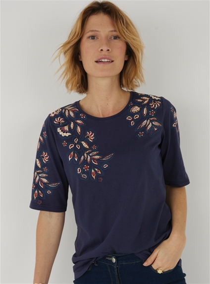 In a beautiful palette of colours, this tee has a placement floral print over the shoulders. A round neckline, short sleeves and made with a viscose mix for cool comfort. 95% Viscose, 5% Elastane.