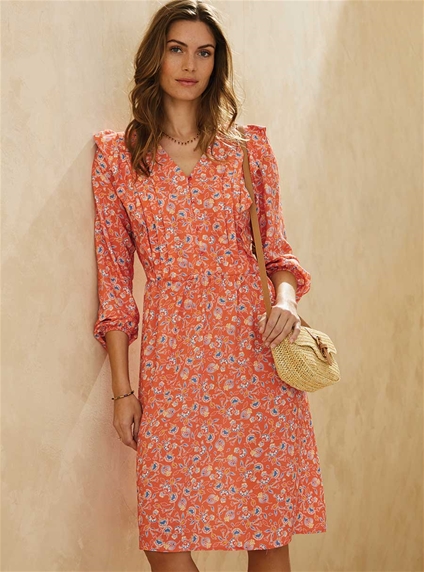 A stylish and flattering lightweight dress. Featuring an all over print, this dress has a V-neckline and elastic cuffs on the long sleeves. Adorned with pleats on the front with a short button placket and ruffle details on the shoulders. 100% Viscose.