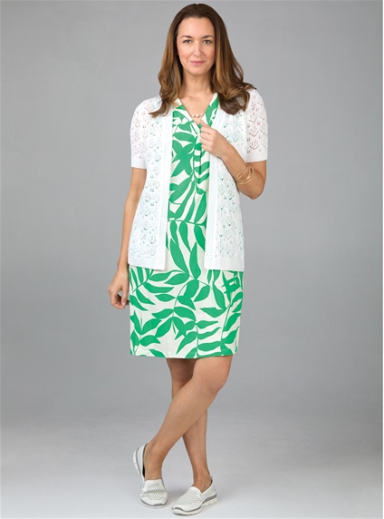 Breeze through warm days in this fresh linenblend shirt dress, featuring a sleeveless cut, lightweight and breathable - it’s designed with a relaxed fit that’s perfect for effortless everyday style. 70% Viscose, 30% Linen. Cardigan not included.