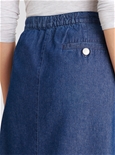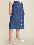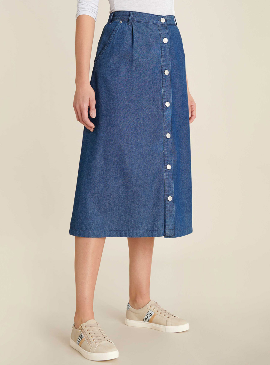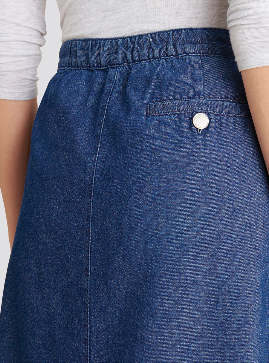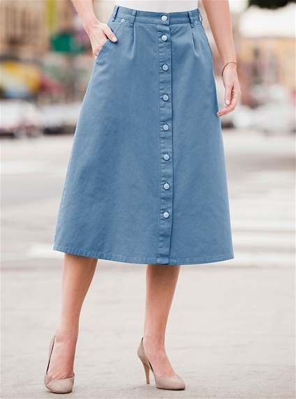 Button front skirt with side pockets and belt loops, great for warm days and holidays in soft washed chambray. Side elastic waist at back. Front pleats. 100% Cotton.