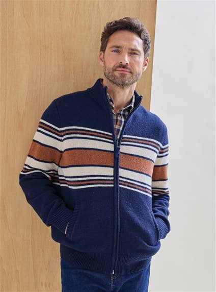 Stripe knit cardigan, with zip closures, rib trim and slant side pockets. Polyamide, Wool, Acrylic, Polyester.