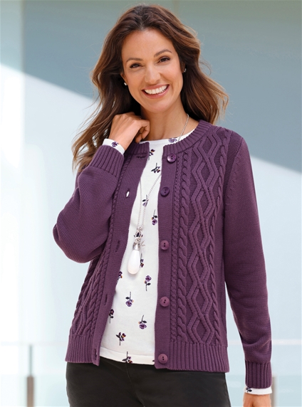 Cardigan with a mix of purl knit, cable and diamond pattern. The back, long sleeves and button placket are plain knit. Ribbed round neckline and hem, elasticated ribbed cuffs on the sleeves. 50% Acrylic, 50% Cotton.