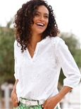 The elaborate 3D floral embroidery all over this pull-on blouse creates a fashionable wow factor, while the cotton quality ensures optimal comfort. It features a round neck with a V cut-out. 3/4-length sleeves with elastic cuffs. Small side slits on the straight hem at the front and a slightly longer and rounded hem at the back. 100% Cotton exclusive of trims.