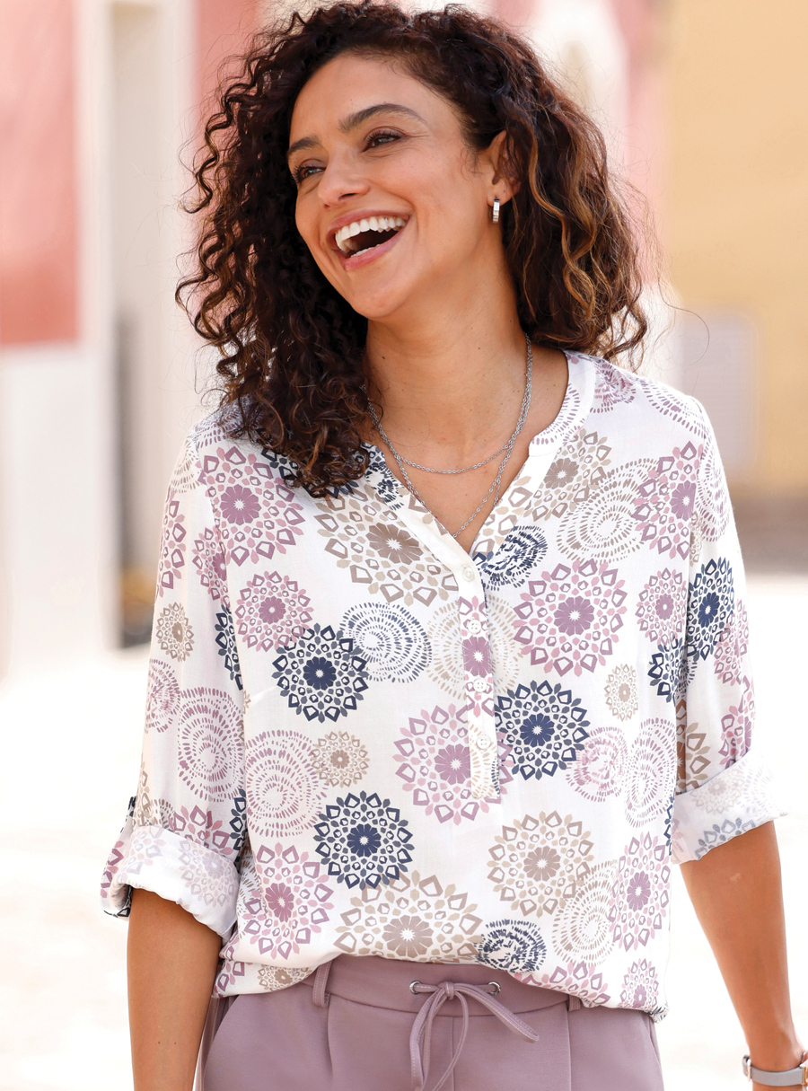 Pleasantly lightweight long-sleeved blouse in an attractive, ornamental print design. Casual slip-on style with a round neckline, small V and short button placket. Wide pleat on the back yoke. The sleeves with button cuffs can be rolled up and fastened with a tab and button. Slightly rounded hem. 100% Viscose.