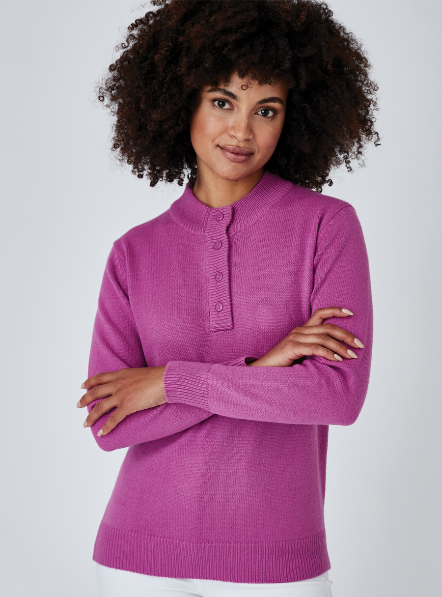 An easy go-to sweater in a brushed textured knit, featuring a stand-up collar and a short button placket front. 100% Acrylic.