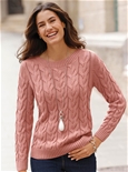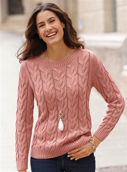 Warm sweater with an intricate cable-knit pattern all over. Modern boat neckline with ribbed trim up to the shoulder. Elasticated ribbed cuffs on the long sleeves and hem.