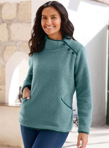 Cosy, soft fleece sweater with decorative buttons on the overlapping stand-up collar. Long sleeves and slightly rounded pockets. The elasticated contrast piping adds a sporty accent.