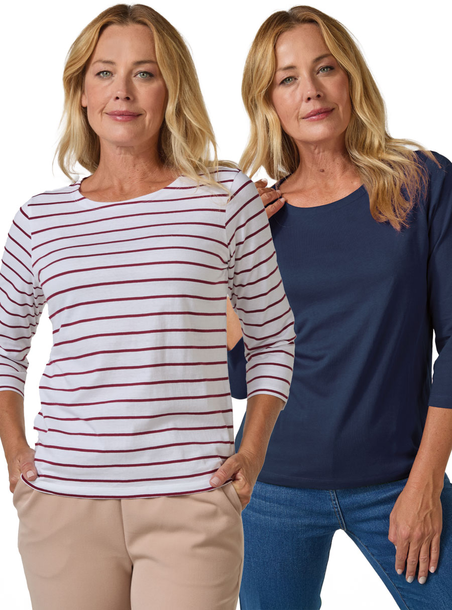 Enjoy our new cotton multi-pack ¾ sleeve tees, combining stripes and solids – perfect for mixing and matching in everyday wear. 100% Cotton.